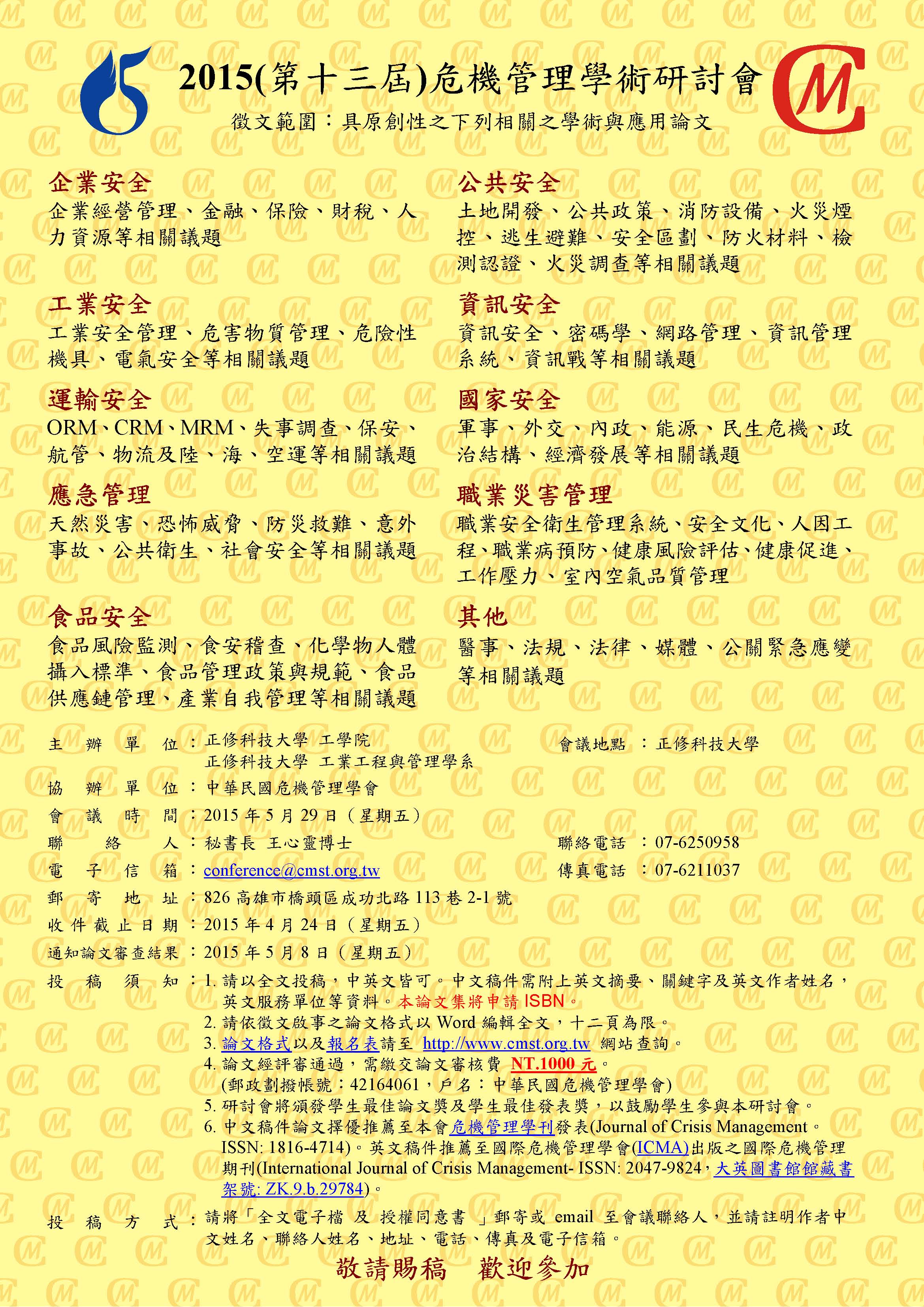 2008(第六屆)危機管理學術研討會,日期改至於97/11/14 (星期五) 於正修科技大學舉辦