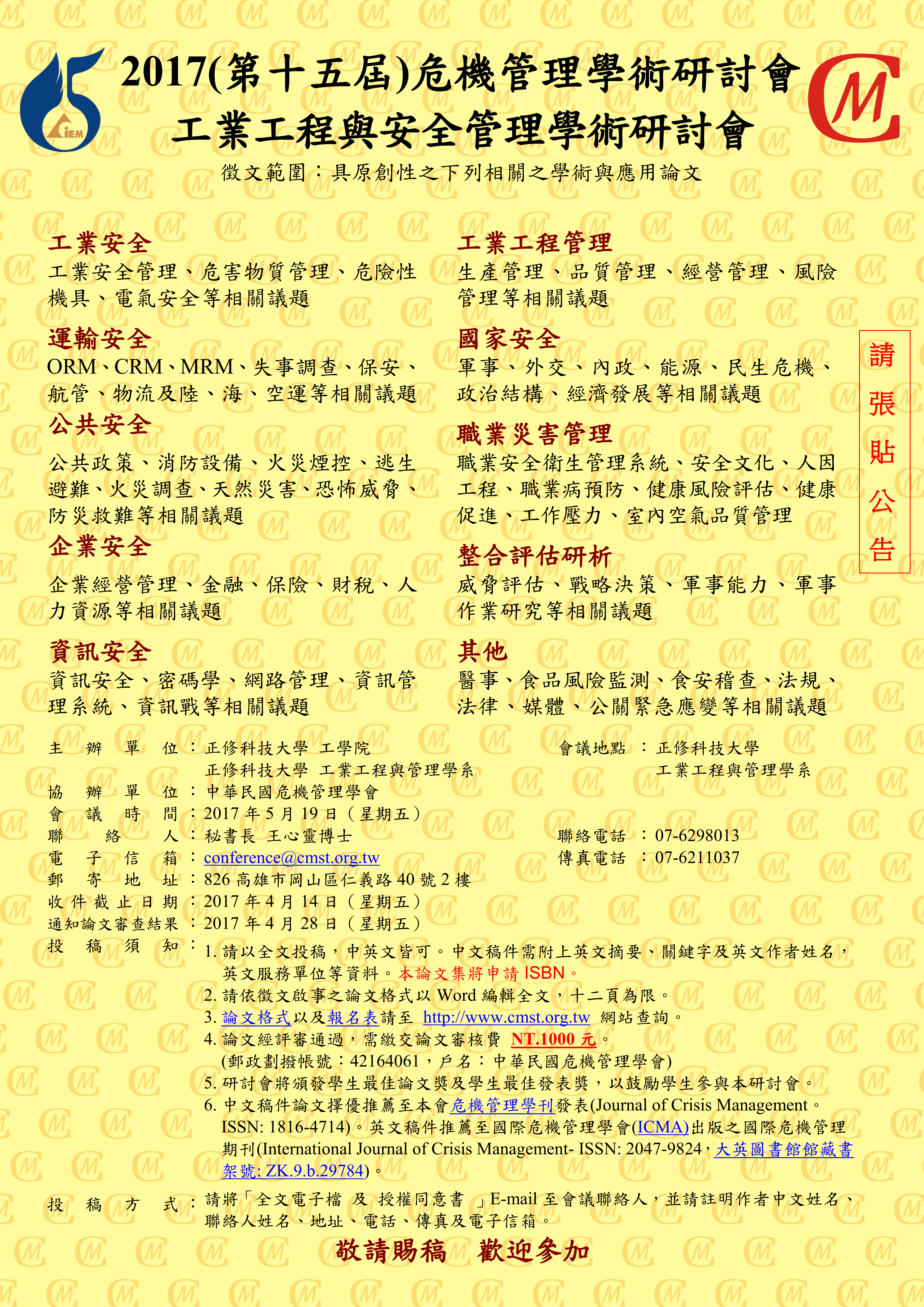 2024(第二十二屆) 危機管理暨工業工程與安全管理研討會,將於2024/5/17在正修科技大學舉辦,歡迎各學術界、產業界、研究單位及相關領域教師、研究生踴躍投稿。